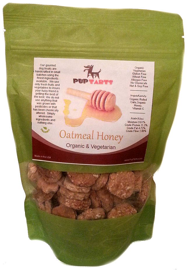 The Honey Oatmeal recipe is a very popular choice among our vegetarian dog treat selection. They are made from organic and all-natural ingredients with nothing artificial. We feature fresh organic honey with rolled oats for a delicious combination of flavor and nutrition. Our blend of ingredients provides a gluten free snack that is suitable for dogs with troublesome digestive systems. Our recipes are designed to be wholesome and nutritious and always gentle on the stomach. We are certain that your special friend will love these treats without any of the unwanted chemicals found in most of the commercial dog biscuits. Like all of our other flavors, these are made with organic human-grade ingredients. Our little friends can suffer from wheat, soy, flour, gluten and dairy allergies. They trust us to provide a wholesome, great tasting treat thats not going to give them tummy troubles. Our gourmet dog treats are prepared with love and give you the best of the best for your puppy. This 8 oz bag contains approximately 50 treats and may vary based on the weight of each treat.